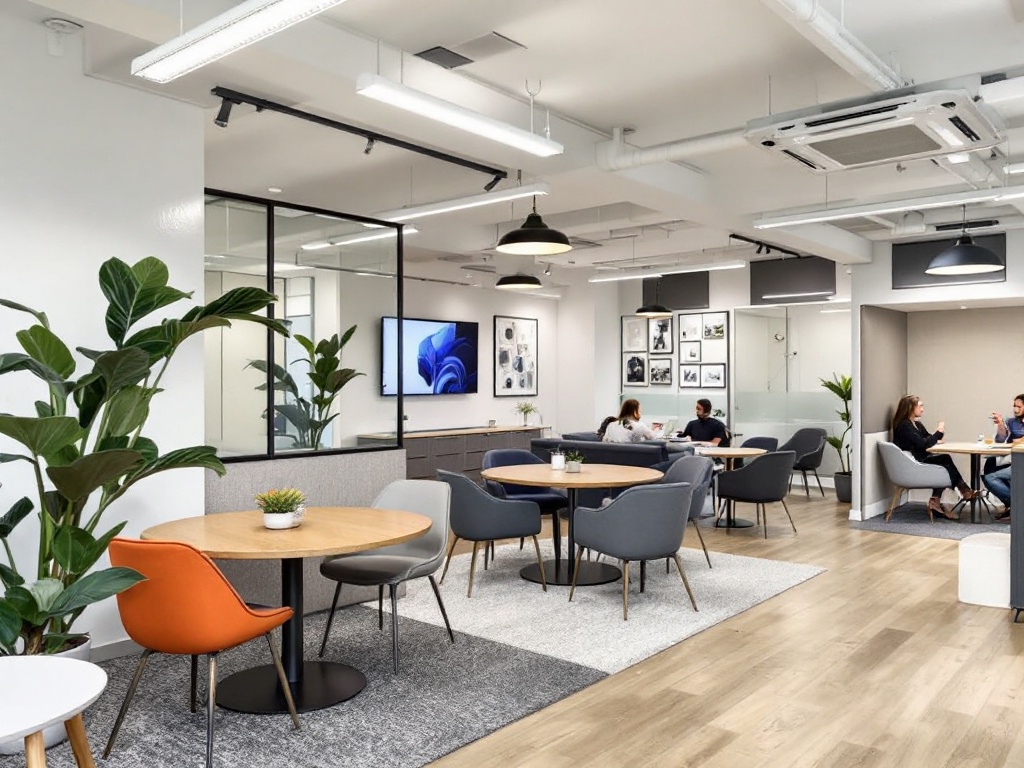 Create a productive and stylish coworking space with open seating, private booths, and collaborative work areas designed by R.CS Contractors of Illinois.